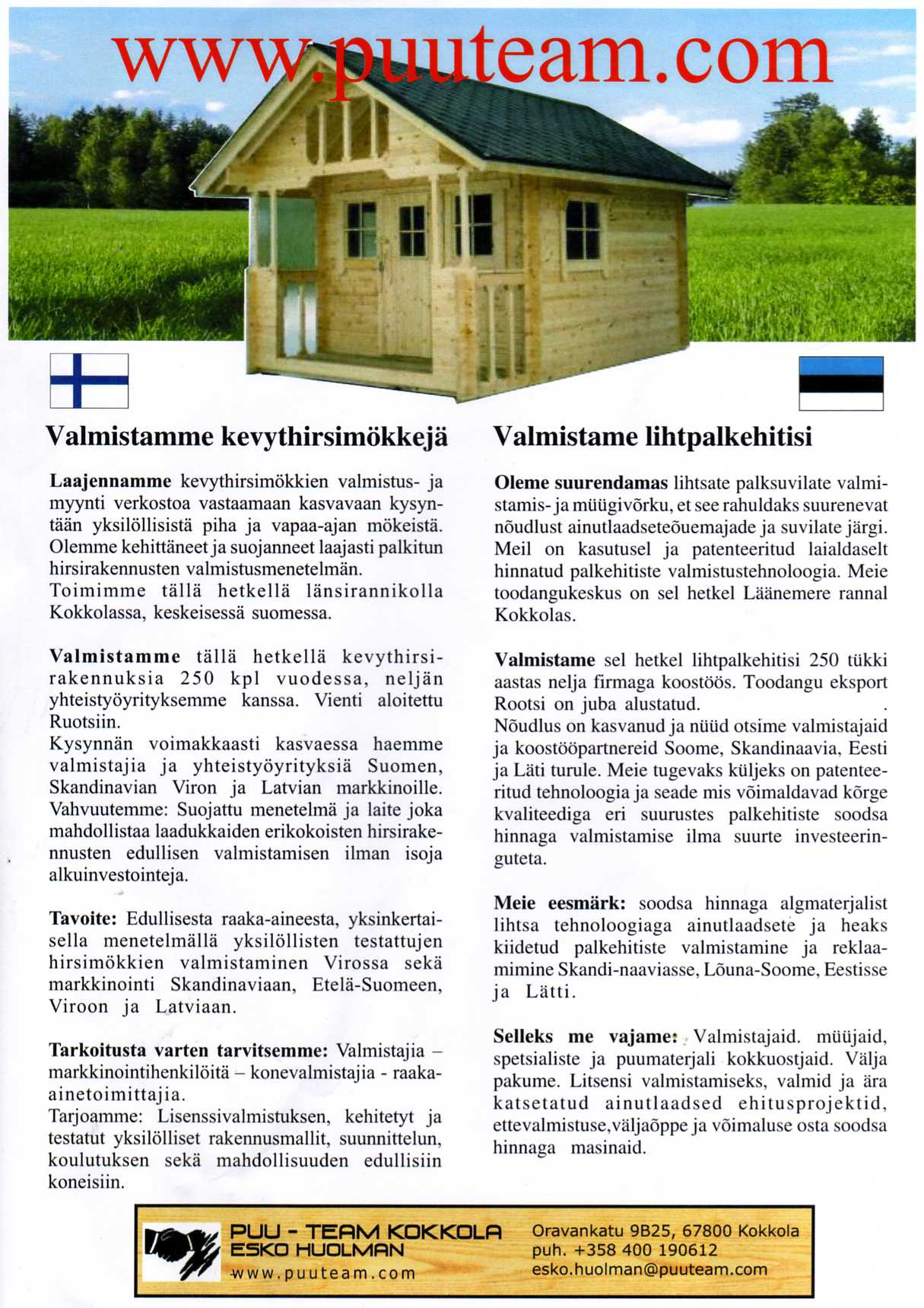 ESITTEET Jos valikoimasta ei löydy mieleistä vaihtoehtoa, niin me kuuntelemme ideoitanne, ja toivomuksianne. Ottakaa toki yhteyttä, jo puhelinkeskustelun ja yksinkertaisen hahmotelman avulla voimme tehdä alustavan kustannusarvion. Terveisiä Esko Huolman |